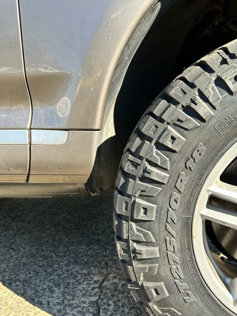 When trimming to fit larger tires (Usually 33"+) on a first generation Cayenne, Touareg, or Q7 the front rocker panel must be cut to avoid rubbing. These steel plates are designed to be welded in after cutting the rocker panel to seal it off and prevent corrosion inside the hollow rocker panel. Once trimmed and welded on, the OE fender liner can be reinstalled as pictured above.